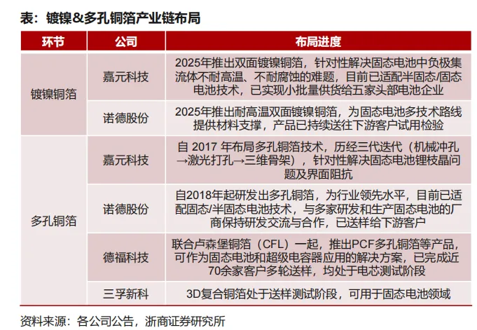 多孔铜箔: 除缓解膨胀外,多孔铜箔还具备轻量化、电阻低、抑制锂枝晶生长等特性。诺德股份、德福科技和三孚新科均有布局,进入小批量送样测试阶段。 多孔铜箔为适配硫化物体系, 仍需在制孔后进行表面镀镍处理。
