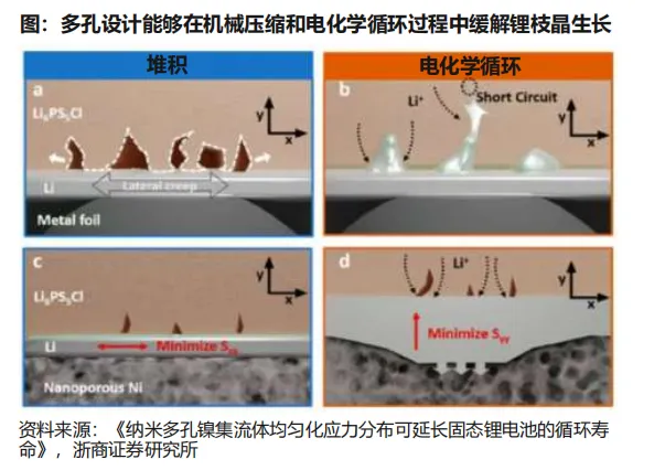 多孔镍集流体使得硫化物电解质与锂金属负极能够适配: 锂金属与硫化物电解质界面稳定性差 ,易发生不可逆化学和电化学反应 ,导致阻抗上升、容量衰减 ,甚至短路 ,核心原因是锂枝晶的不可控生长。相关研究发现,多孔镍集流体可以在电池极高压制造条件下缓解硫化物电解质横向蠕变裂纹 ,并进一步在电化学循环时缓解锂枝晶生长 ,有效延长电池循环寿命。