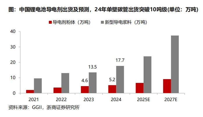 对于固态电解质: 添加碳纳米管核心逻辑是以最小的性能牺牲(电解质导电性提高)换取关键短板(界面接触差)的改善 , 目的是填充电极与电解质间的空隙从而降低界面阻抗, 碳纳米管的添加量与产品代际随固态电池性能需求提升。