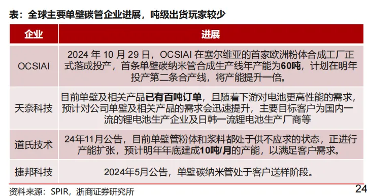 据GGII , 2024年中国单壁碳纳米管浆料出货突破10吨级; 据SPIR,单壁碳管大规模生产需解决性能稳定性问题,目前全球实现吨级生产的只有OCSiAl、天奈科技及道氏技术,其他企业多在中试或小试阶段。