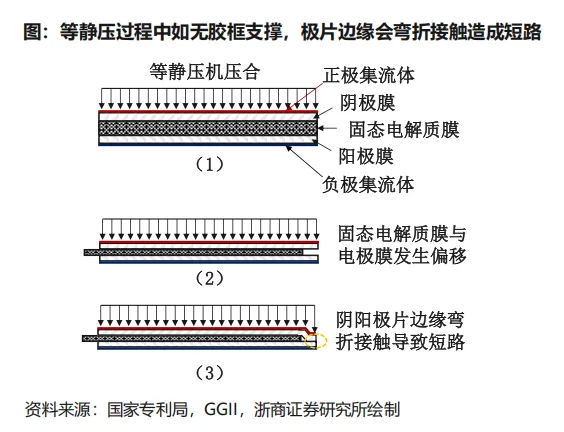 等静压的衍生问题: 硫化物固态电池生产工艺中, 为确保固态电解质膜与电极膜之间紧密贴合, 采用等静压工艺进行压合处理,但压合过程中固态电解质膜与电极膜之间会发生偏移,导致阳极膜和阴极膜边沿处发生弯折接触进而造成短路;