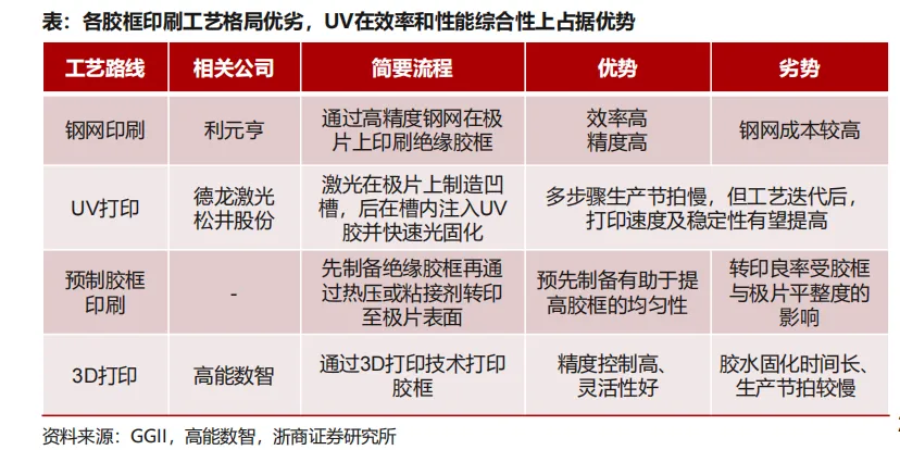 解决方案: 目前解决方案是在极片边缘处增设一个回形胶框,起到支撑和绝缘作用。可行的胶框打印技术路线包括钢网印刷、 UV打印、预制胶框打印、点胶工艺、 3D打印等。路线各有利弊,其中UV打印精度和效率提升空间大,业内关注度高。