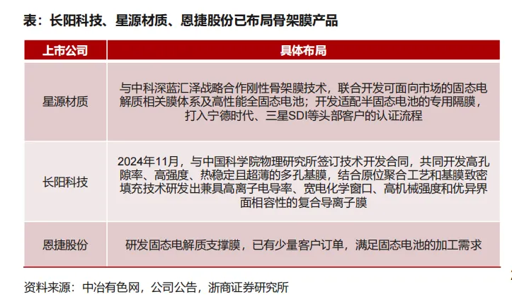 产品: 基于骨架膜的固态电解质膜类似“钢筋混凝土” ,在预先制备好骨架膜(钢筋)中填充固态电解质(水泥) ,然后通过原位聚合等技术制成电解质膜。 目前星源材质、长阳科技、恩捷股份等已布局骨架膜产品 ,和星源材质合作的中科深蓝汇泽已发布融合刚性骨架与柔性导电电解质的聚合物固态电池。