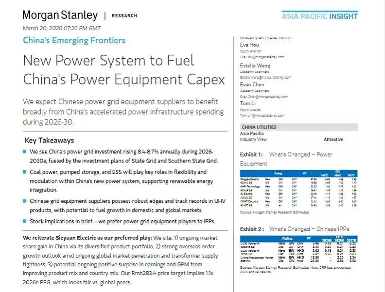 摩根士丹利强调,特高压输电线路是十五五规划的重点发展领域。研报预计,2026~2030年期间将投运超过25条特高压输电线路,专门解决我国“西部有能源、东部有用电” 的地理错配,是西电东送的核心载体;电网设备制造商们将直接受益于此,这些公司在产品供应和满足国内不同行业需求方面拥有强大的增长潜力。