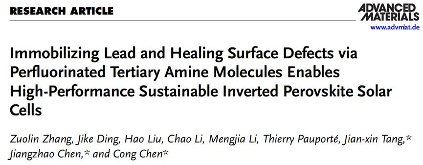 河北工业大学层状材料与器件研究团队在国际顶级材料期刊Advanced Materials发表题为“Immobilizing Lead and Healing Surface Defects via Perfluorinated Tertiary Amine Molecules Enables High-Performance Sustainable Inverted Perovskite Solar Cells”的重要研究成果。论文由本团队陈聪教授担任通讯作者,并与唐建新教授(澳门科技大学)和陈江照教授(昆明理工大学)合作完成。
