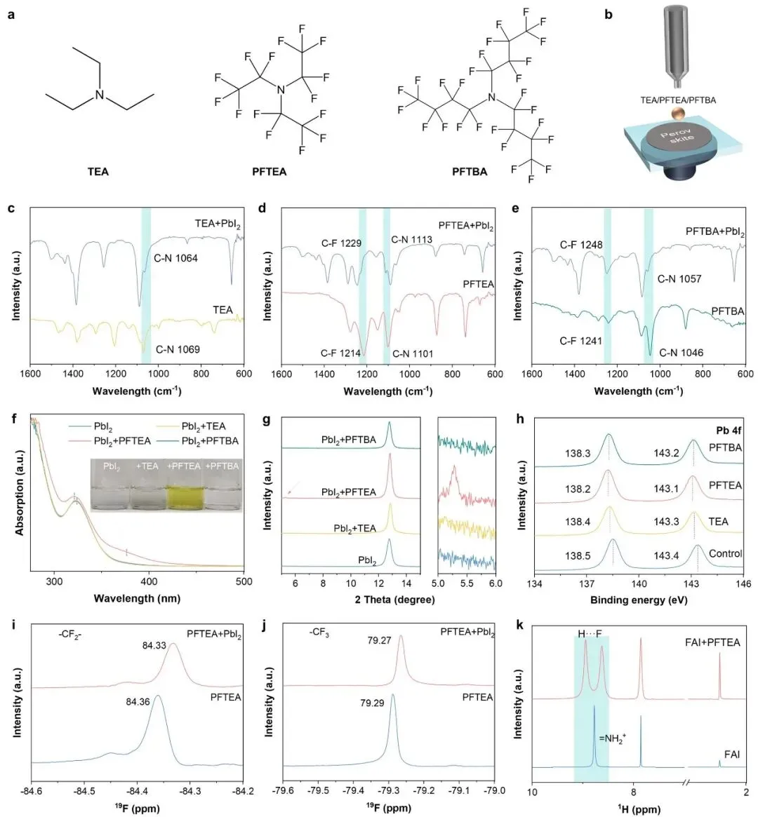 本工作围绕“如何同时实现缺陷钝化与铅离子固定”这一核心问题,设计了一种分子对比策略。研究团队选取了三种结构相似但氟原子数量不同的分子:三乙胺(TEA)、全氟三乙胺(PFTEA)和全氟三丁胺(PFTBA),系统比较全氟化程度和分子空间结构对界面调控效果的影响。通过傅里叶红外光谱(FTIR)、X射线光电子能谱(XPS)、核磁共振(NMR)以及X射线衍射(XRD)等手段,验证分子与PbI2之间的相互作用。结果表明,PFTEA能够与PbI2形成稳定的PFTEA·PbI2络合结构,说明其与Pb2+之间存在较强配位作用。同时,PFTEA中的氟原子还能与FA+形成氢键作用,从而进一步抑制有机阳离子空位的产生。相比之下,无氟的TEA作用较弱,而氟原子过多、分子体积较大的PFTBA则因空间位阻影响,界面作用强度反而下降。采用真空闪蒸法制备钙钛矿薄膜,实现了高重复性与可规模化的制备过程。通过系统的光伏性能测试与稳定性评估,验证了该全氟化策略在效率提升、稳定性增强以及铅泄漏抑制方面的综合优势。