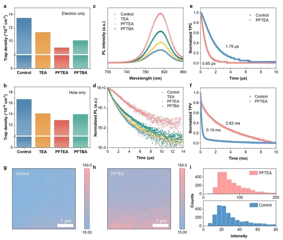 PFTEA能最有效降低钙钛矿薄膜的陷阱态密度、抑制非辐射复合,并延长载流子寿命,显示其在薄膜表面缺陷钝化和载流子动力学优化方面具有优异性能