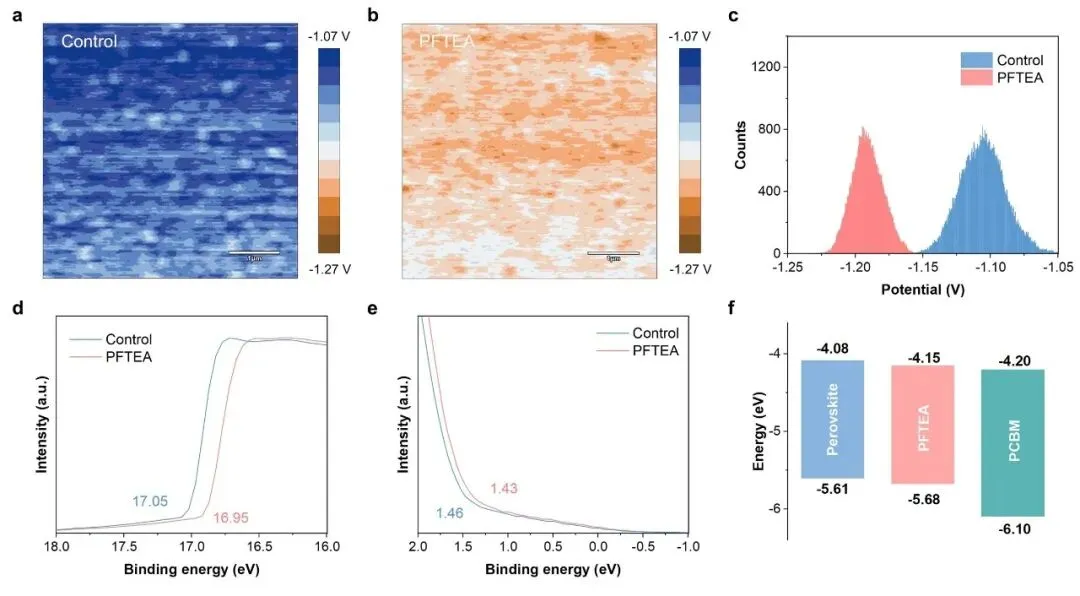 PFTEA钝化显著调节了钙钛矿薄膜的表面势分布,使表面电势更加均匀以及能级对齐,从而有利于载流子注入和器件性能的提升