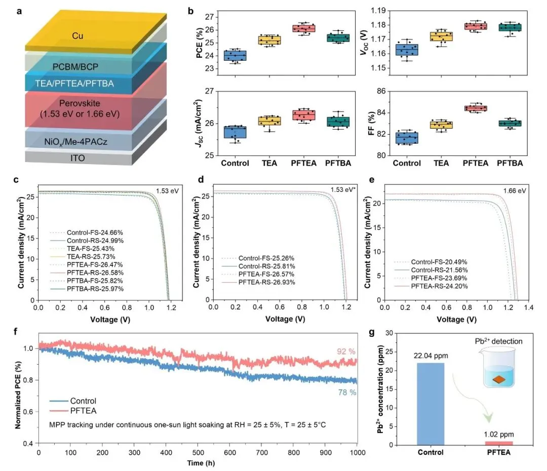 反式(p-i-n)钙钛矿太阳能电池在实现高效率的同时,仍受到表面缺陷诱导的非辐射复合与铅泄漏环境风险的双重制约。本工作提出了一种通用的全氟化分子策略,通过引入全氟叔胺分子PFTEA,在钙钛矿表面构建强配位络合结构,实现Pb2+固定与缺陷协同钝化。PFTEA可与PbI2形成稳定的PFTEA·PbI2络合物,同时通过F原子与FA+之间的氢键作用抑制有机阳离子空位的形成,从而显著降低表面非辐射复合。基于该策略构建的1.53 eV反式器件实现了26.93%的最高效率(认证稳态效率26.65%),创下文章发表时真空闪蒸法制备钙钛矿电池的效率纪录;宽带隙1.66 eV器件效率达到24.20%。同时,器件在1000 h最大功率点跟踪测试后仍保持92%的初始效率,且铅泄漏浓度显著降低,为可持续钙钛矿光伏技术提供了有效解决方案。