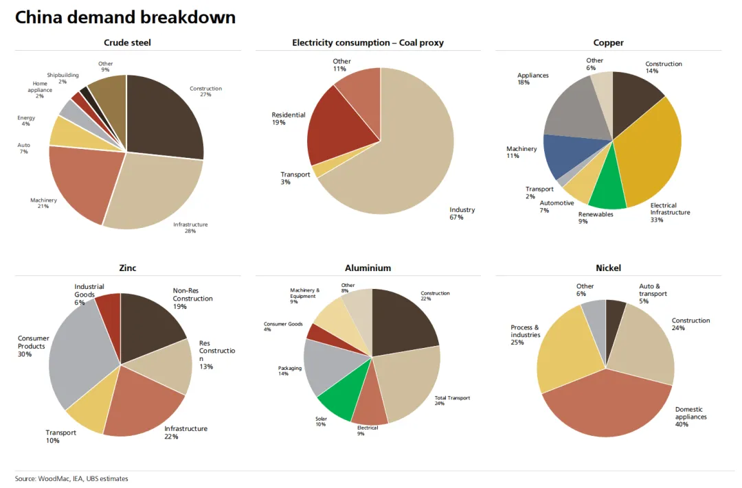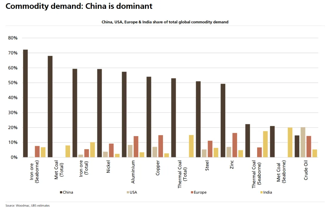 铁矿石、铜、铝等关键商品,对中国需求依赖极高;多个品种中,中国占全球需求比例达到40%到70%以上。