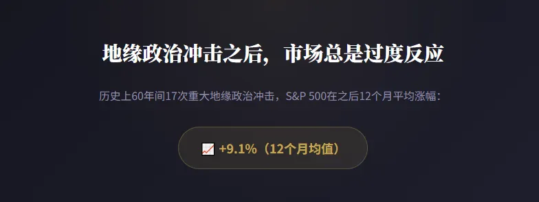 因为市场总是高估短期冲击的持久性,历史上每一次大的地缘政治冲击,S&P 500在之后12个月平均上涨9.1%。