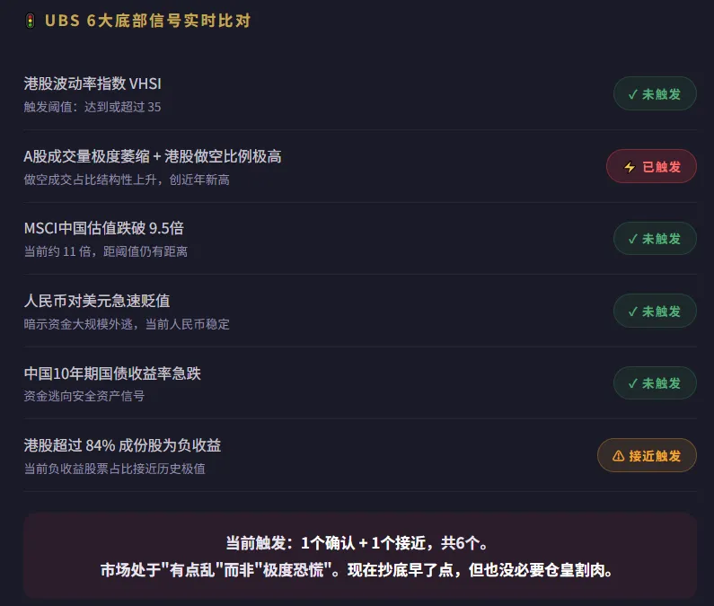 UBS总结了10年内6次极度恐慌、市场出现无序抛售的历史案例,提炼出6个底部信号。每当这些信号全面触发,市场往往在之后3个月平均反弹23%。值得等待的信号。