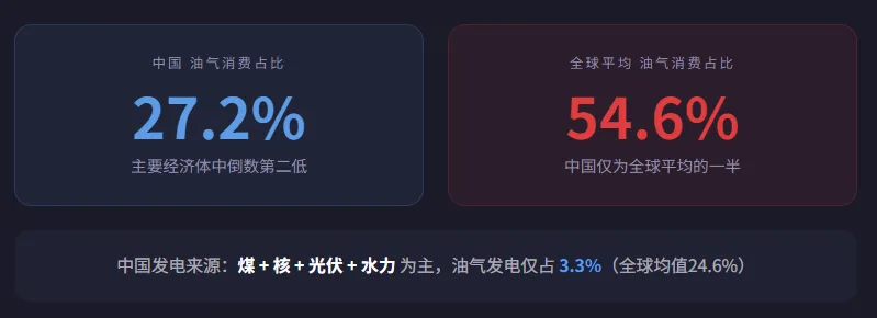 油气在中国能源消费中只占27.2%,全球平均水平是54.6%。中国靠煤靠核靠光伏靠水力,对中东石油的依赖程度在全球主要经济体里是倒数第二低的。油气发电占中国总发电量的3.3%,全球平均24.6%。