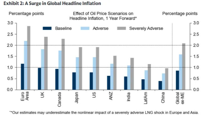 1、全球整体通胀:基准场景下,未来1年全球整体通胀将抬升0.8个百分点;极端场景下抬升2个百分点,且未来1-2个月会迎来大幅冲高,海峡重启后影响会部分逆转。