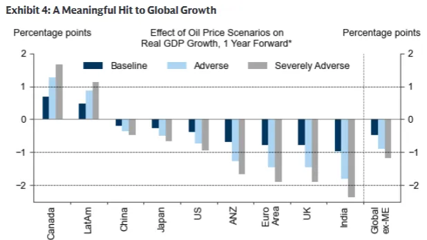 高油价会压制居民实际收入、企业生产与就业,进而限制工资-价格螺旋的形成,这也是核心通胀可控的重要原因,但全球经济增长将因此承压: