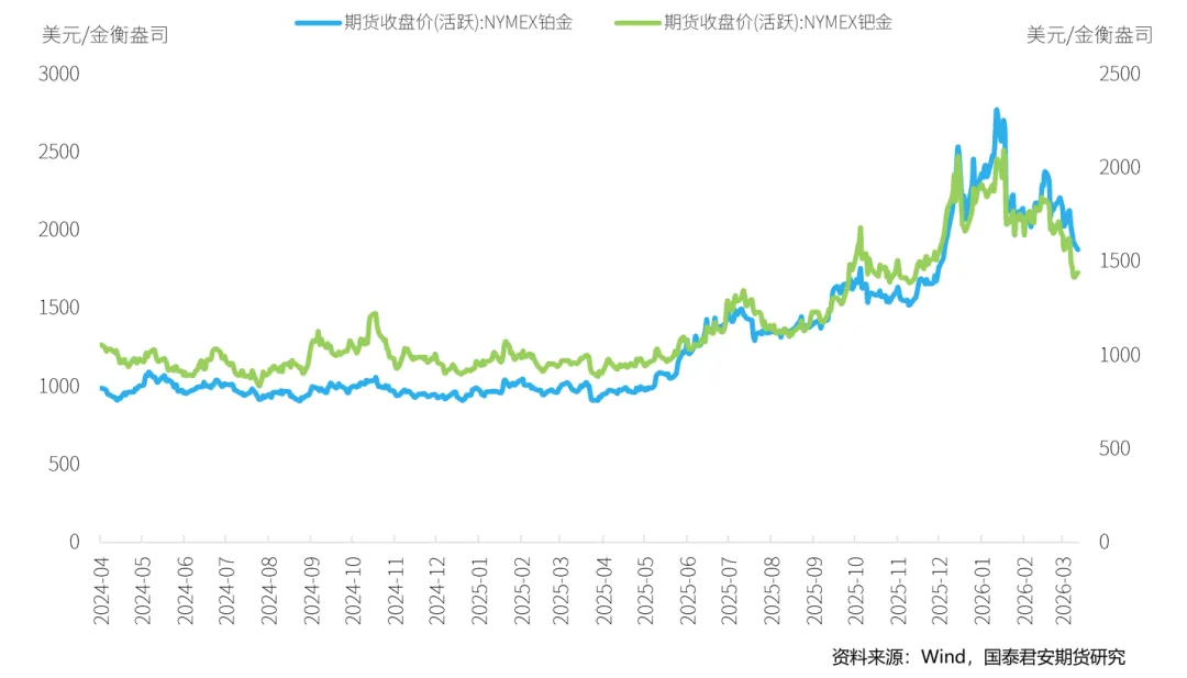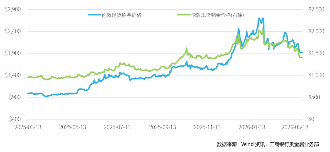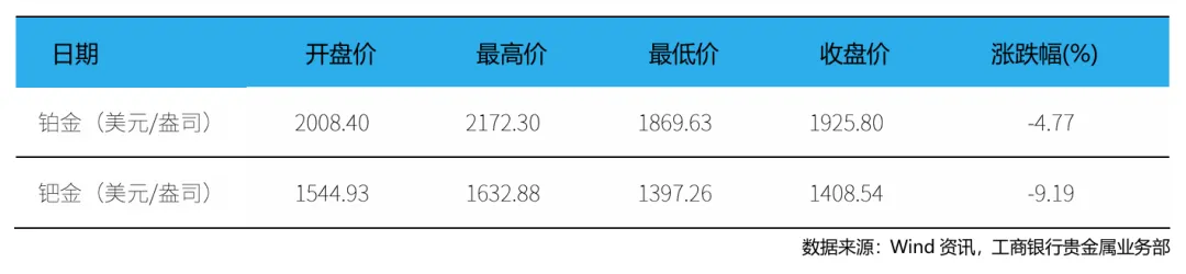 本周, 铂金期货价格大幅下跌,截至2026年3月20日,NYMEX铂金期货价格收盘价为1920.2美元/盎司,周累计下跌5.16%。钯金方面,本周NYMEX钯金期货同样下跌,周五收盘价为1414.5美元/盎司,周下跌9.39%。