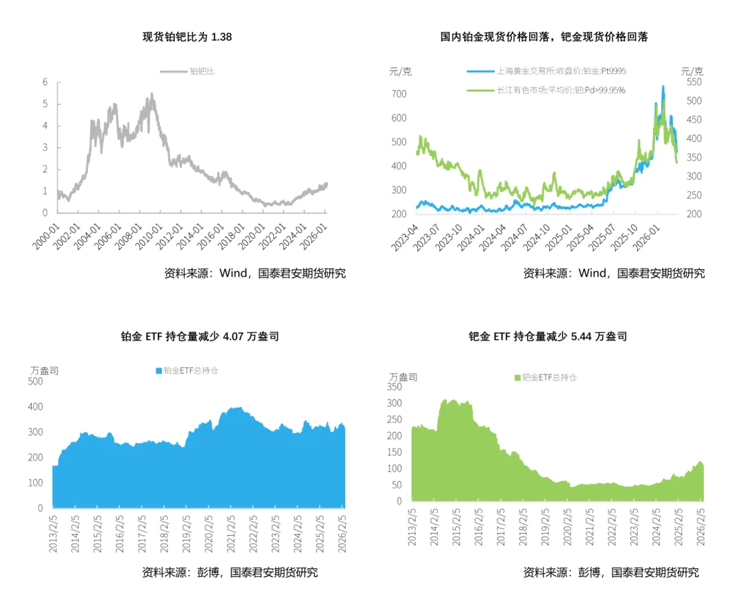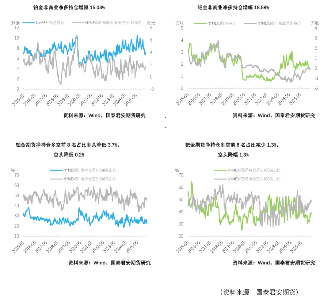 截至2026年3月17日,铂金总持仓较上周减少1466张,其中非商业多头方面减少224张,非商业空头持仓较上周减少2432张,降幅15.48%。因此,非商业净多头持仓增加2208张,增幅15.03%。钯金方面,总持仓减少123张,降幅0.78%,其中非商业多头持仓增加103张,增幅1.44%,空头增加132张,增幅1.81%,因而非商业净多持仓减少29张,增幅18.59%。在净持仓多空前8名占比上,本周铂金方面净持仓多头占比降低3.7%,空头占比降低0.2%,钯金方面多头占比减少1.3%,空头占比降幅1.3%。