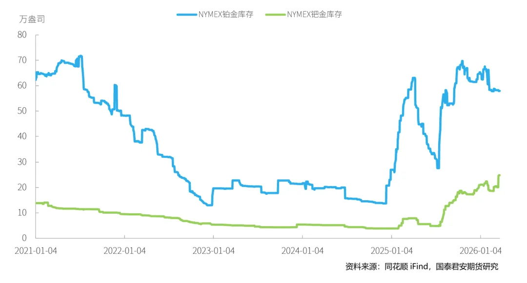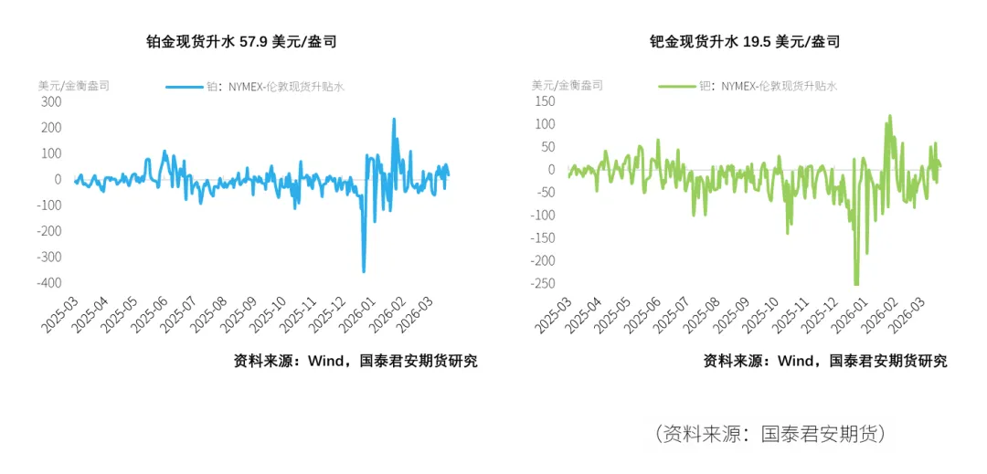 截至2026年3月20日,当周NYMEX铂金库存去库0.32万盎司,钯金期货库存累库。在现货升贴水方面,本周铂金升贴水以升水格局为主,以周五收盘价来看升水57.9美元/盎司。钯金同样升水,周五升水19.5美元/盎司。ETF持仓量情况,铂金持仓量回落,其全球ETF持仓量本周减少4.07万盎司,钯金持仓量回落,ETF持仓量本周减少5.44万盎司。