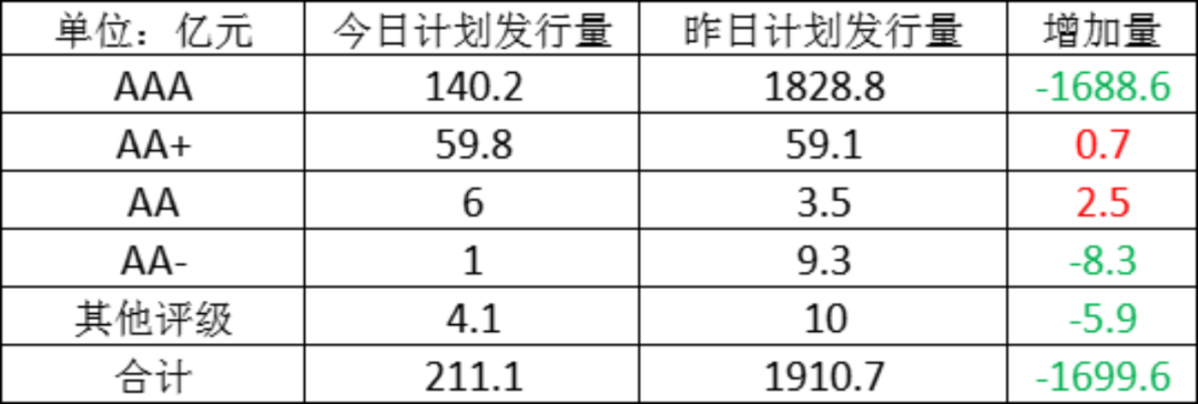 今日存单计划发行量规211.1亿元,较上一工作日计划发行量大幅减少,减少了1699.6亿元。