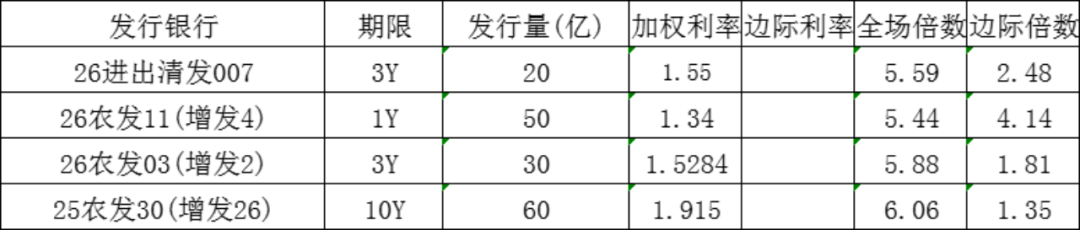 今日农业发展银行发行1年政策性金融债,发行量50亿元,发行利率1.34%,投标倍数5.44倍,边际倍数4.14倍;农业发展银行发行3年政策性金融债,发行量30亿元,发行利率1.5284%,投标倍数5.88倍,边际倍数1.81倍;农业发展银行发行10年政策性金融债,发行量60亿元,发行利率1.915%,投标倍数6.06倍,边际倍数1.35倍。