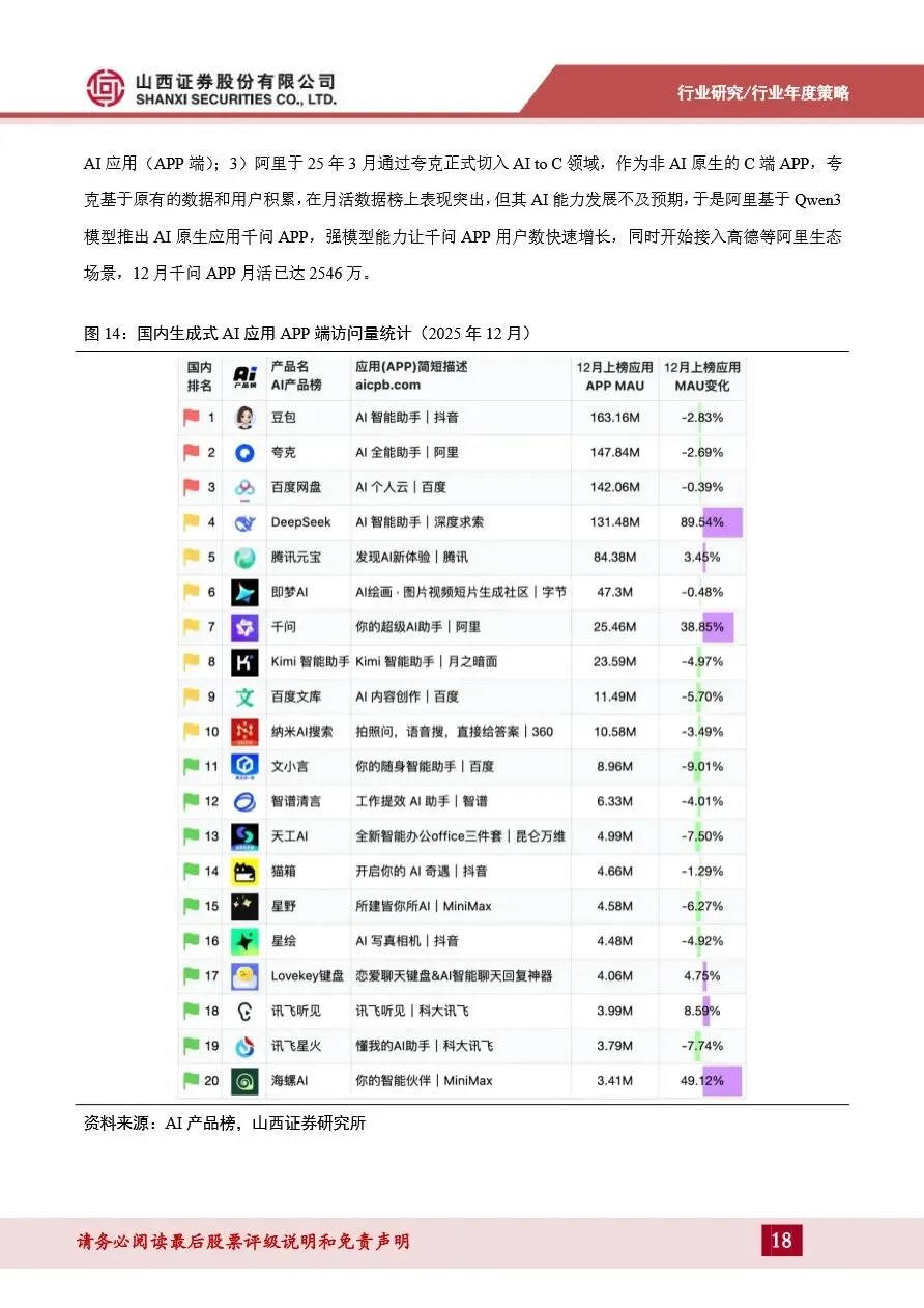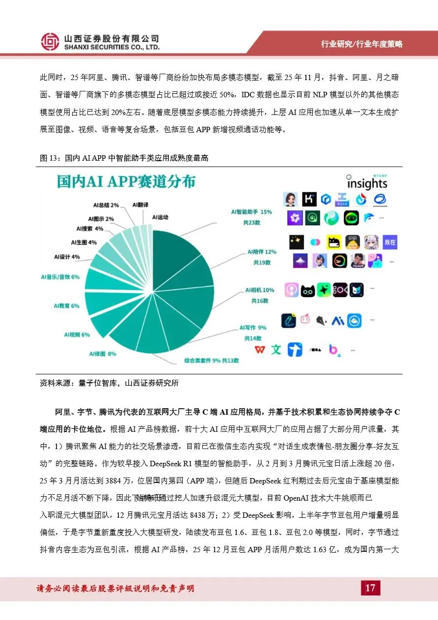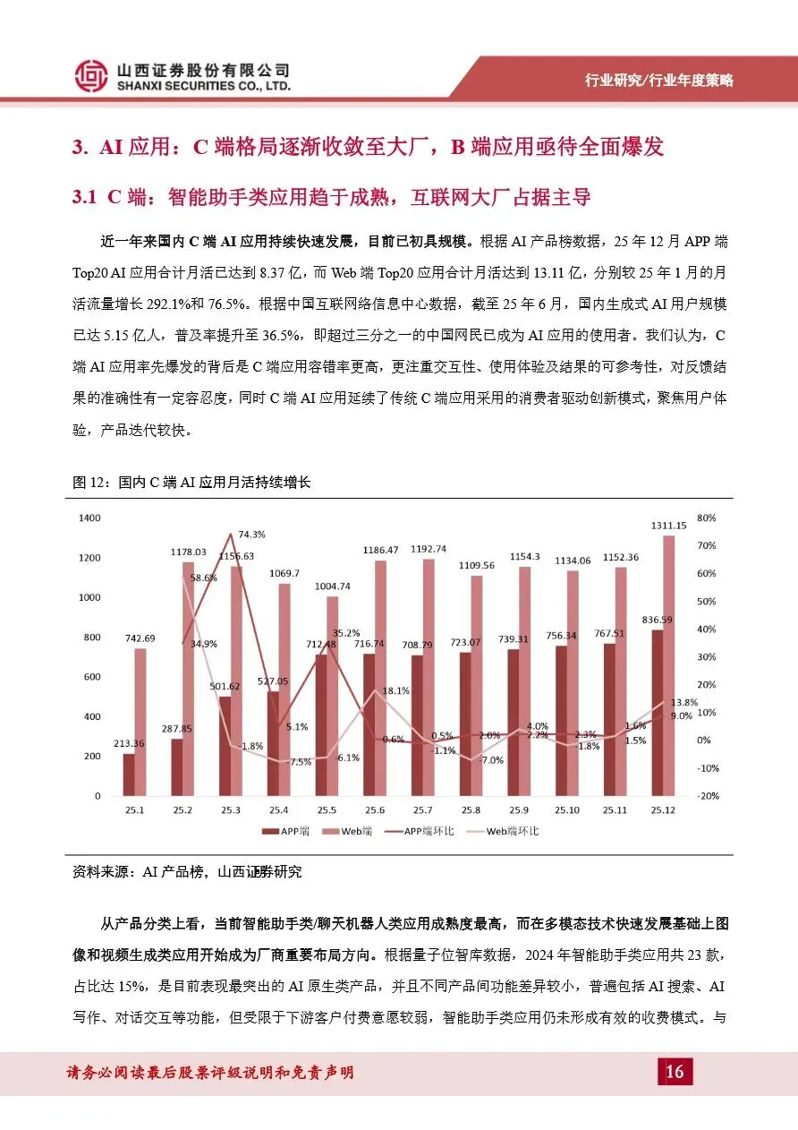 计算机行业年度策略报告强调,AI应用即将迎来爆发期,特别是B端应用将在2026年全面爆发。随着模型技术的持续迭代和成本的显著下降,AI应用在智能客服、知识库问答等高频场景已率先实现规模化落地,并向AI+工业制造、AI+医疗等复杂垂直领域拓展。在这些领域,具备高壁垒的复杂垂类应用成为投资热点,独立软件厂商凭借深厚的行业积累和合规背书,展现出显著优势。同时,C端AI应用格局逐渐收敛至互联网大厂,智能助手类应用趋于成熟,多模态技术快速发展推动了图像和视频生成类应用的兴起。展望未来,AI应用的全面爆发将带动云计算和数据中心市场的快速增长,为计算机行业带来新的增长点。