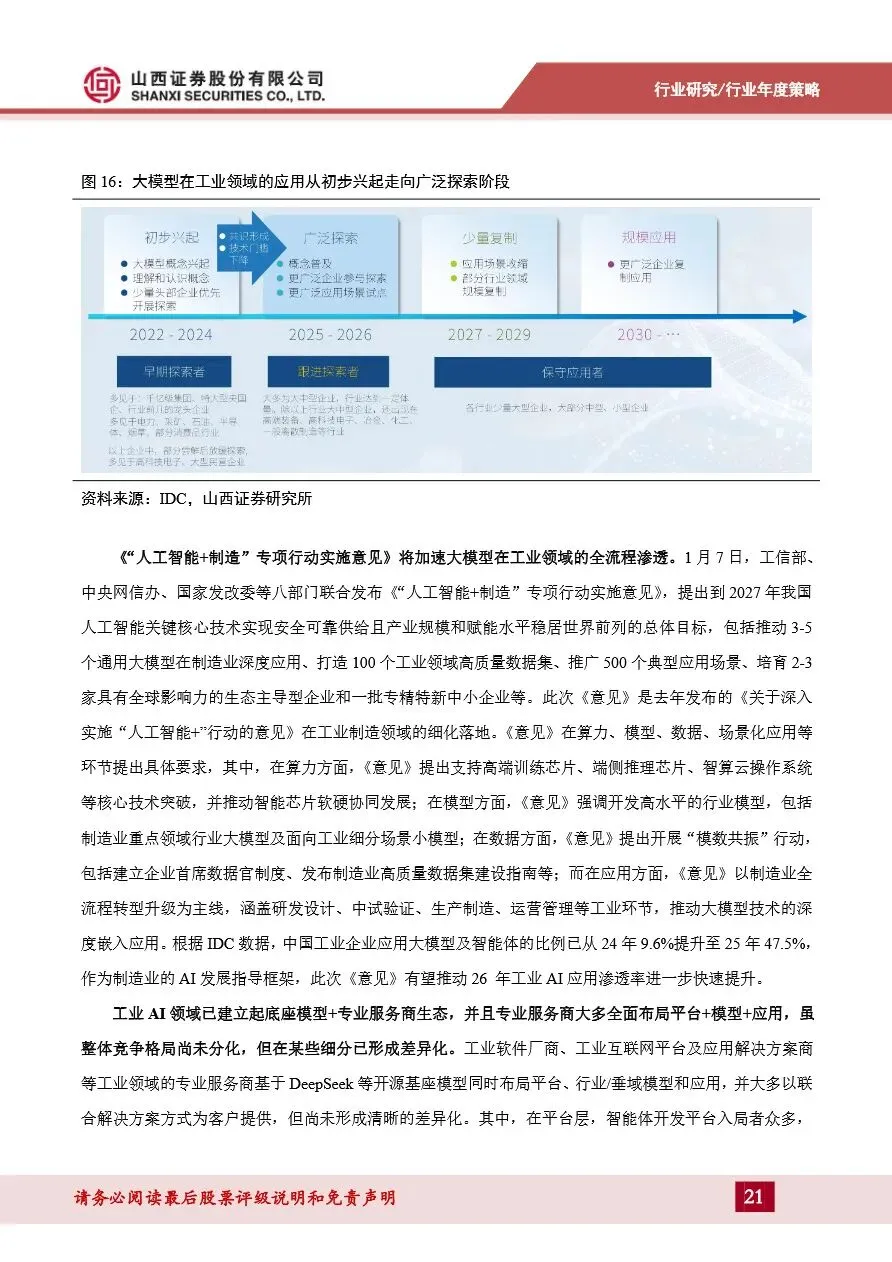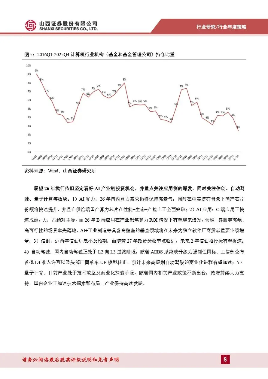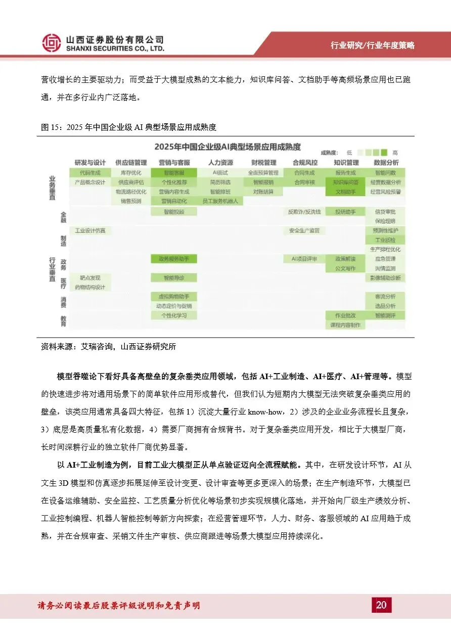 计算机行业年度策略报告强调,AI应用即将迎来爆发期,特别是B端应用将在2026年全面爆发。随着模型技术的持续迭代和成本的显著下降,AI应用在智能客服、知识库问答等高频场景已率先实现规模化落地,并向AI+工业制造、AI+医疗等复杂垂直领域拓展。在这些领域,具备高壁垒的复杂垂类应用成为投资热点,独立软件厂商凭借深厚的行业积累和合规背书,展现出显著优势。同时,C端AI应用格局逐渐收敛至互联网大厂,智能助手类应用趋于成熟,多模态技术快速发展推动了图像和视频生成类应用的兴起。展望未来,AI应用的全面爆发将带动云计算和数据中心市场的快速增长,为计算机行业带来新的增长点。