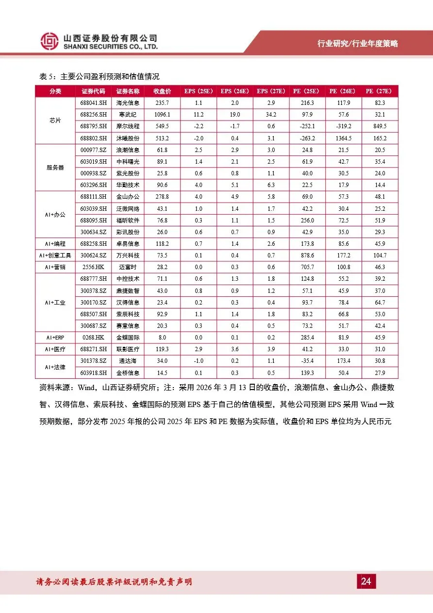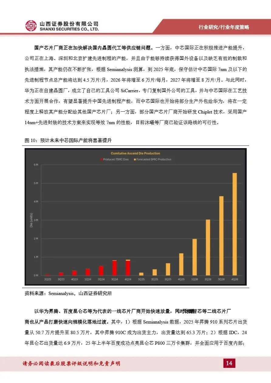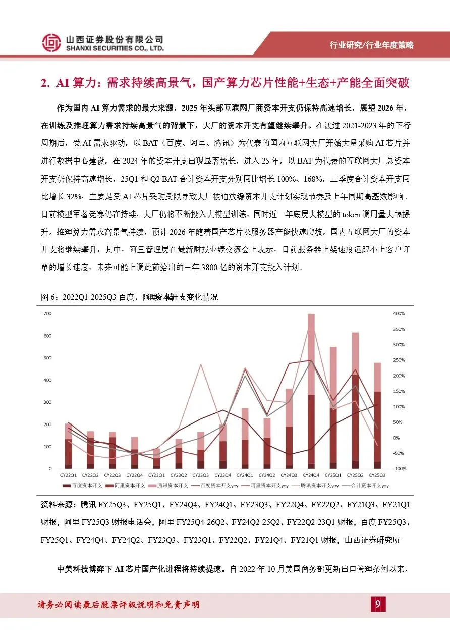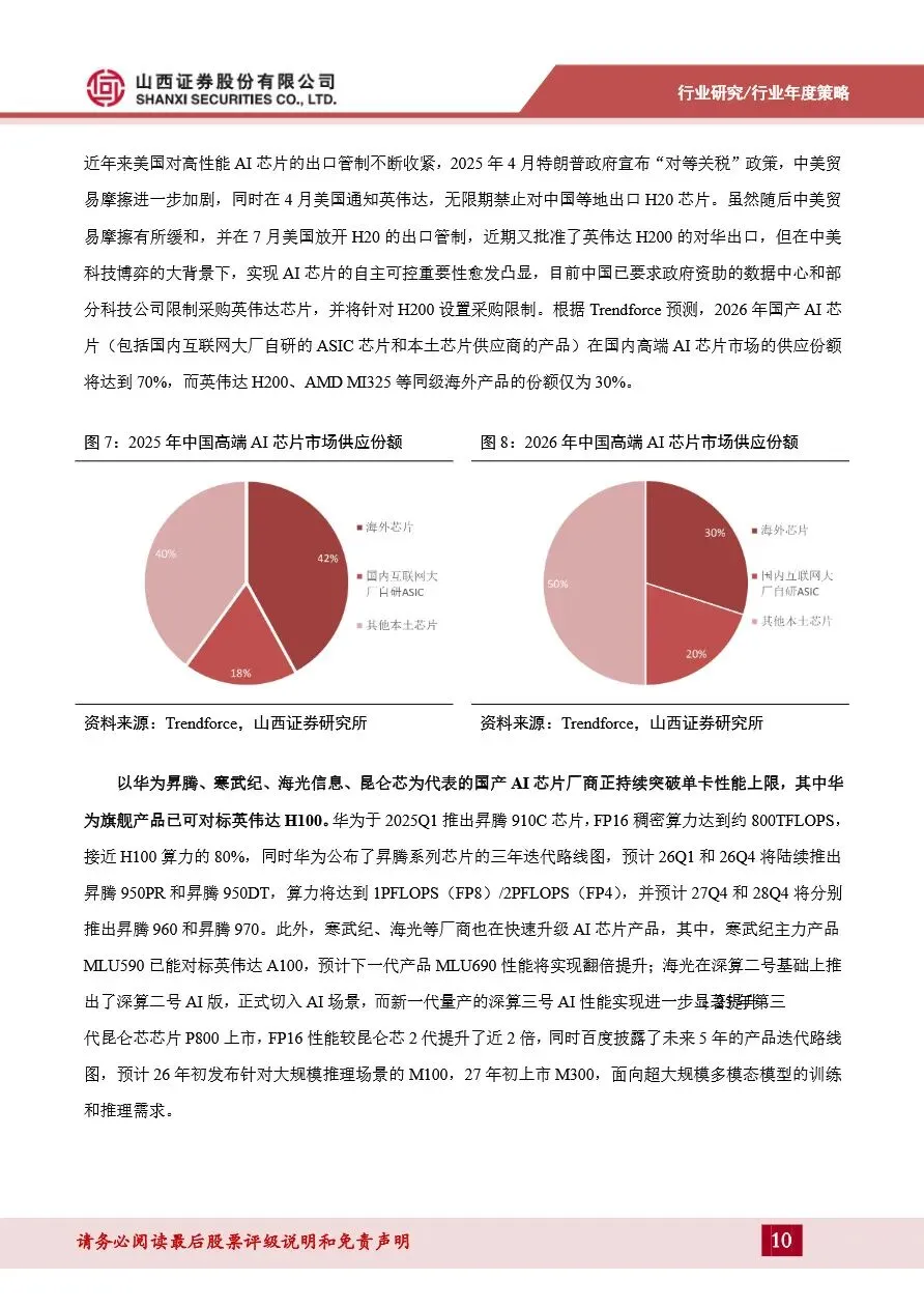 2026年计算机行业策略报告指出,AI算力需求持续高景气,成为推动行业增长的核心动力。随着国内互联网大厂资本开支的不断攀升,以及中美科技博弈下AI芯片国产化进程的加速,国产算力芯片在性能、生态和产能上实现了全面突破。以华为昇腾、寒武纪、海光信息为代表的国产芯片厂商,不仅在单卡性能上加速追赶英伟达,还通过兼容CUDA及自研生态的方式,逐渐打破CUDA生态壁垒。同时,国产芯片厂商正加快解决晶圆代工等供应链问题,推动国产芯片快速放量,预计未来几年内,国产AI芯片在国内高端市场的供应份额将大幅提升,为AI应用的爆发提供坚实支撑。