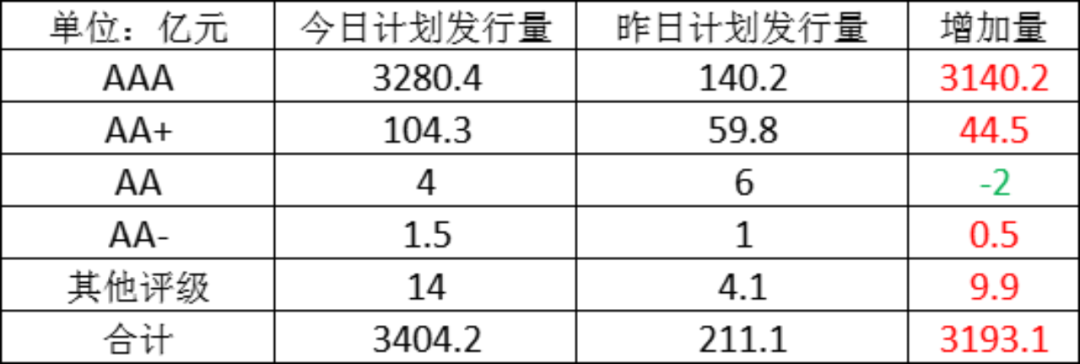 今日存单计划发行量规3404.2亿元,较上一工作日计划发行量大幅增加,增加了3193.1亿元。