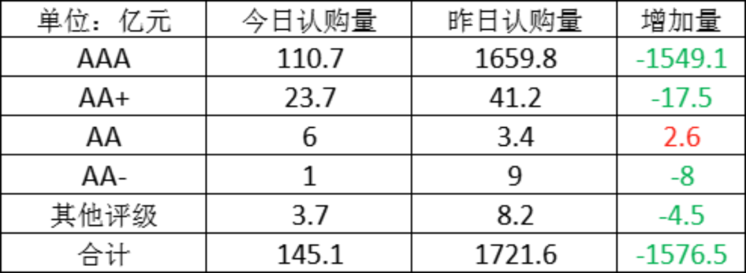 今日存单认购量规模145.1亿元,较上一工作日认购量大幅减少,减少了1576.5亿元。