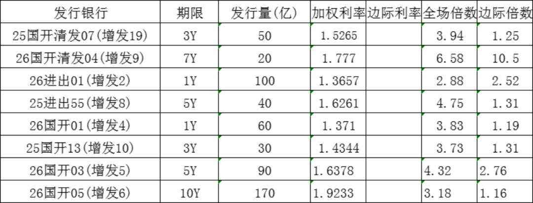 今日国家开发银行发行3年政策性金融债,发行量30亿元,发行利率1.4344%,投标倍数3.73倍,边际倍数1.31倍;国家开发银行发行5年政策性金融债,发行量90亿元,发行利率1.6378%,投标倍数4.32倍,边际倍数2.76倍;国家开发银行发行10年政策性金融债,发行量170亿元,发行利率1.9233%,投标倍数3.18倍,边际倍数1.16倍。