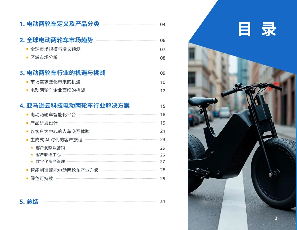 摘要:手册分析了全球电动两轮车市场正在迎来的电动化、智能化、全球化三重机遇,预计2030年全球市场规模将达1186.57亿美元。亚马逊云科技通过云计算、AI、物联网等技术,为企业提供从研发设计、生产制造到全球营销、售后的全价值链数字化解决方案,助力企业突破数据安全、生产效率、出海合规等痛点,加速行业智能化升级与全球化布局。