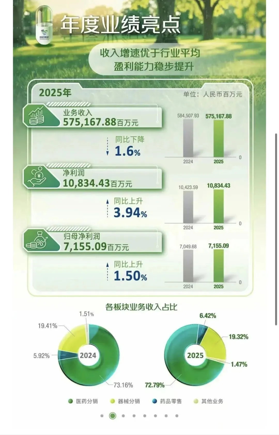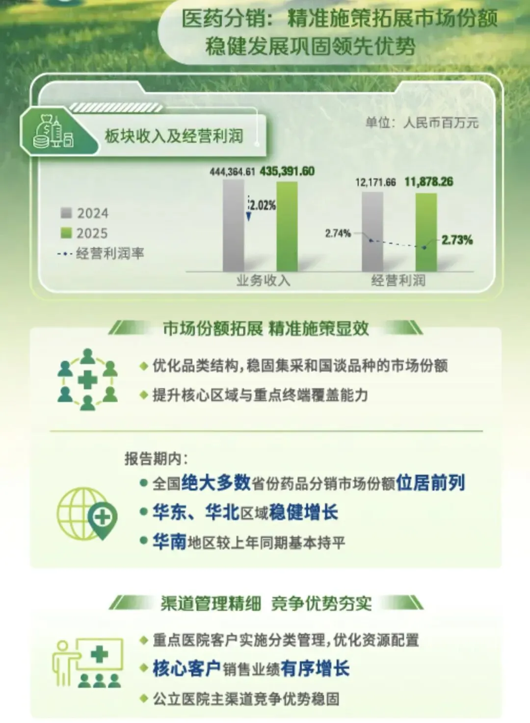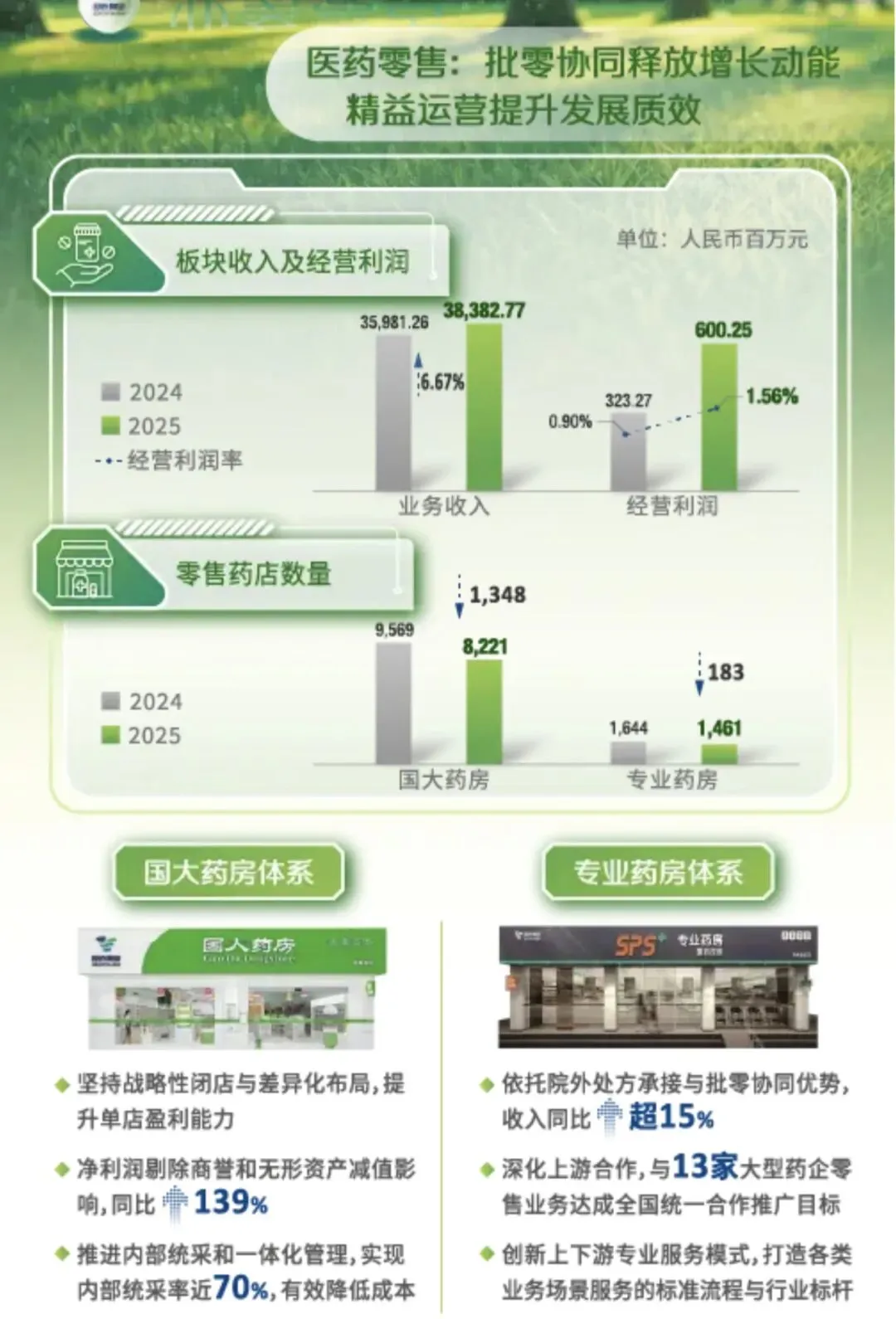 将整体业绩拆解至业务板块,两家公司的发展路径差异更为具体和深刻。国药控股的业务结构呈现出典型的“大象转身”特征。其两大基石业务——医药分销(营收4353.92亿元,占比72.79%)和器械分销(营收1155.38亿元,占比19.32%)收入均同比下降2.02%,是拖累整体营收的主因。这背后,是药品与医疗器械集采政策常态化、深化的直接影响,以及市场竞争白热化带来的压力。然而,其医药零售板块(营收383.83亿元)同比增长6.67%,成为亮点。更值得关注的是,旗下核心零售主体国大药房亏损额从上一年的11.04亿元大幅收窄至2.17亿元,减亏近9亿元。这一巨变无疑是其净利润能够逆势增长的关键“功臣”,表明其零售业务的提质增效、批零协同战略开始显现成效。华润医药则展现了“多点开花、协同并进”的活力。其医药分销业务作为基本盘(营收2200.80亿元),在覆盖28个省份、服务约26万家客户的庞大网络基础上,仍实现了3.2%的稳步增长。医药零售业务(营收122.10亿元)则以20.8%的同比增速迅猛发展,其中DTP(直接面向患者)专业药房业务贡献了主要增长动力,显示其在高价值药品服务终端布局上的成功。最为亮眼的是其制药业务(营收510.39亿元),同比增长10.2%,且毛利率高达60.5%。该板块的高增长,一方面受益于自身产品的市场竞争力,另一方面则直接得益于外延并购的并表贡献,例如对天士力相关资产的整合,有效壮大了其在心脑血管等领域的实力。制药板块的高毛利特性,也成为拉升公司整体盈利水平的核心引擎。三、 行业变局下的策略应对