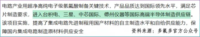 不过,实力尚在,公司电子级氢氟酸是台积电在我国大陆的第一家供应商,其还打入了三星、中芯国际供应链,能进入头部本身就证明了公司的技术实力。
