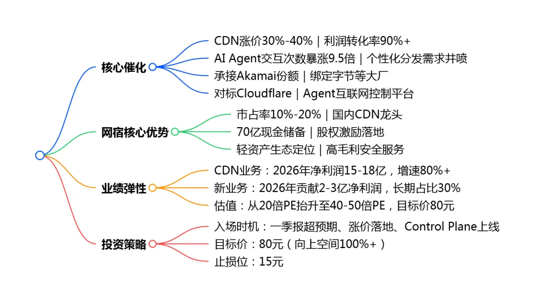 公司从「传统CDN服务商」升级为「Agent生态核心控制平台」,对标Cloudflare的轻资产、高毛利模式,估值中枢迎来重估,股价向上空间超100%。