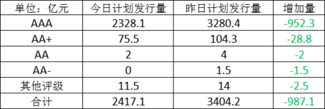 今日存单计划发行量规2417.1亿元,较上一工作日计划发行量大幅减少,减少了987.1亿元。