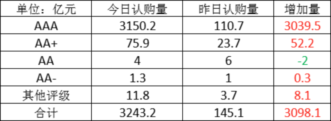 今日存单认购量规模3243.2亿元,较上一工作日认购量大幅增加,增加了3098.1亿元。