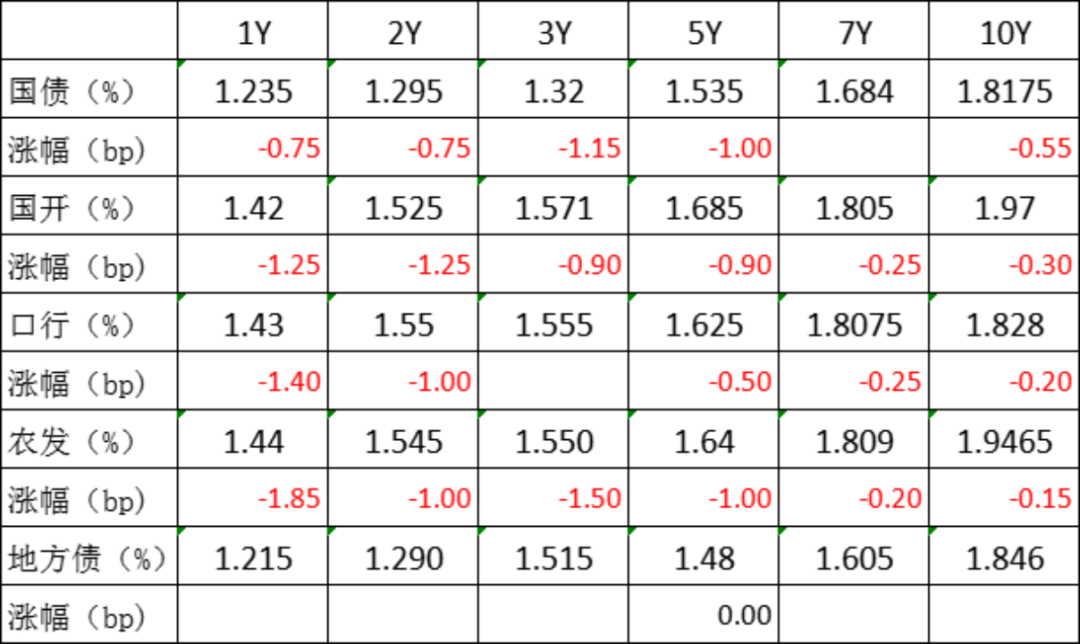 截止17:15,利率债二级市场中,利率成交价格总体呈下跌趋势,其中下跌程度较大的有1年期农发债,收益率下跌1.85bp,报1.44%;3年期农发债,收益率下跌1.5bp,报1.55%;1年期口行债,收益率下跌1.4bp,报1.43%,1年期国开债,收益率下跌1.25bp,报1.42%。