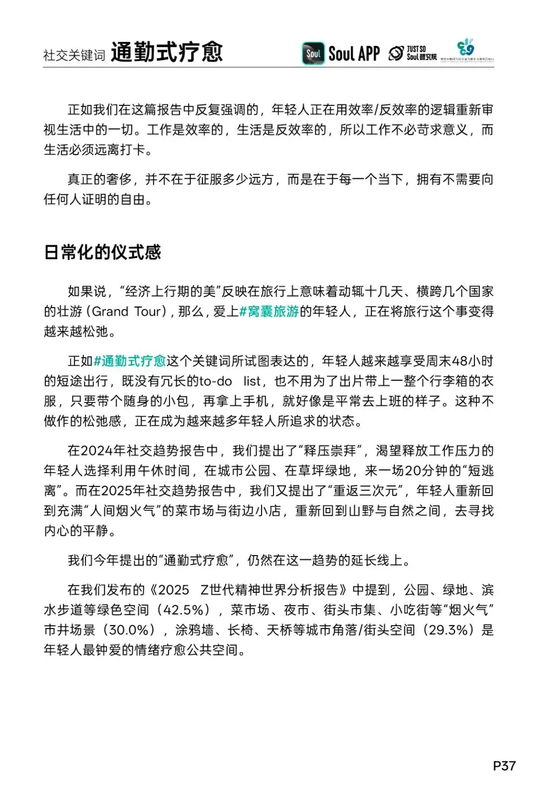 6、通勤式疗愈:年轻人越来越享受周末48小时的短途出行,既没有冗长的to-dolist,也不带清单,不带行李,随手挎个包、拿上手机,就像平日通勤一样自然。在生活半径内创造"可即达的平行时空",让年轻人每个当下都拥有不需要向任何人证明的自由。