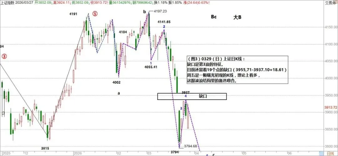 根据月线和周线的波浪结构,对应日线,将1月14日的高点4191看作是⑤浪的终点,那么,从4191开始了abc的三浪调整。
