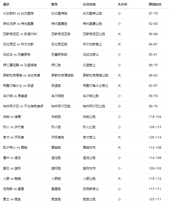 周日篮球301-319研报汇总19场汇总表我个人最看好的 5 个方向特内里费胜、巴斯克尼亚胜、热火让胜、火箭让胜、掘金让胜。相对更适合防冷/防赢球输盘的 4 个方向:巴伦西亚让负、班堡让负、拜仁让负、尼克斯受让。