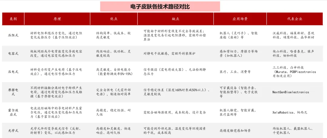 当前多种技术路径并行,根据应用场景,各有优势。电子皮肤可感知外界压力、温度、湿度、流场和材质等,按照转换信号原理的不同,可分为压阻式(电阻式)、电容式、压电式、摩擦电式、光电式等。