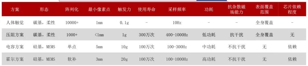 压阻式方案具有五大优势:1)适配性强;2)检测灵敏度高;3)全掌覆盖;4)通信带宽要求低;5)指尖切向力测量可通过其他结构方式弥补。
