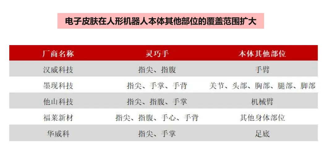 单台人形机器人一般配置两只灵巧手,人形机器人规模化量产有望带动电子皮肤市场快速扩容。此外,除了灵巧手,在手臂、腿部和脚掌等部位均已开始尝试和发展,单台机器人电子皮肤用量呈上升趋势。