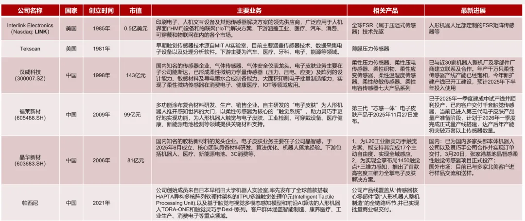 中游:主要为电子皮肤的生产制造商,海外市场占据主导,国产化率有望提升。据普华有策消息,2024年全球前五大厂商Interlink、Novasentis、Tekscan、JDI、Baumer和Fraba合计占据约40%以上的市场份额。国内企业如汉威科技、福莱新材、帕西尼、晶华新材等进展迅速。