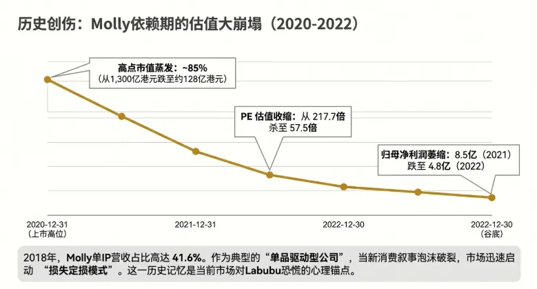 Molly 作为泡泡玛特的起家 IP,曾长期主导公司的营收结构。2018 年 Molly 营收占比高达 41.6%。2020 年底上市初期,受“新消费概念股”叙事溢价驱动,市值一度冲破 1,300 亿港元。