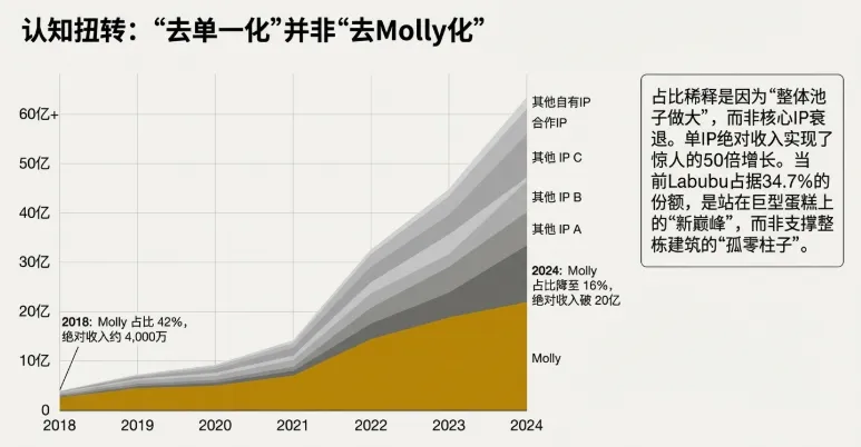 2022 年(份额超越): SKULLPANDA 营收首次超过 Molly。 2023-2024 年(多层梯队): Molly 占比降至 16%,但绝对收入从 2017 年的 4000 万增长至 2024 年约 20 亿。 2025 年 H1(系统化爆发): 13 个 IP 营收破亿,新 IP“星星人”首年营收达 3.9 亿元,验证了系统化孵化能力。
