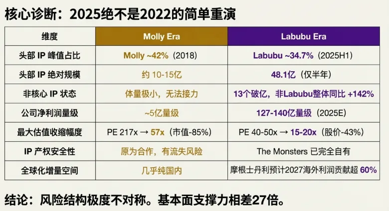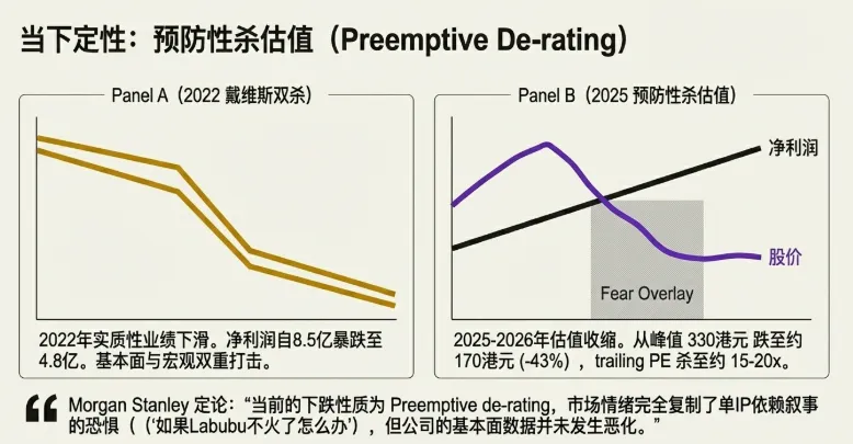 不同点(当前风险更温和): 摩根士丹利定性当前为“预防性杀估值(preemptive de-rating)”。由于利润规模相差 27 倍,即使 Labubu 热度大幅下滑,公司仍有超过 130 亿的利润支撑。