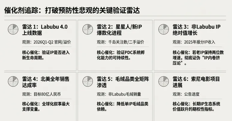 Labubu 4.0 销售数据: 2026 年 Q1-Q2 上线,验证 IP 新生命周期。 非 Labubu IP 增长: 若 Molly/SP/Crybaby 持续两位数增长,则“IP 挤压论”证伪。 北美市场: 全年 80 亿人民币销售目标能否达成。