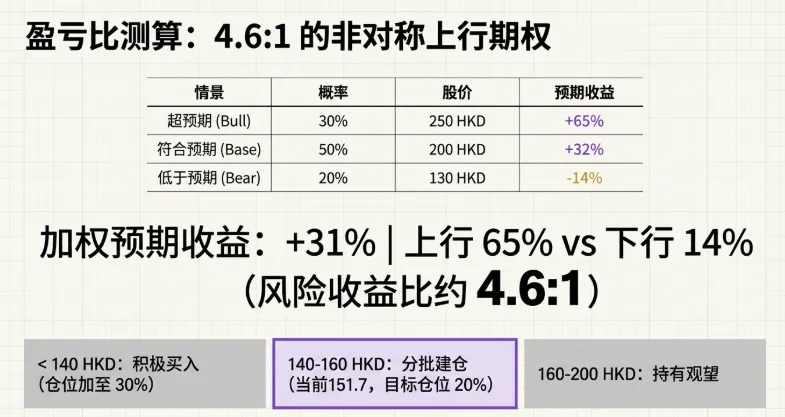 当前泡泡玛特拥有更稳健的内部孵化体系(PDC)、更健康的 IP 矩阵以及显著增长的全球化收益。在管理层一贯保守的业绩指引下,即使按保守假设预测,当前股价仍具备约 32% 的上行空间,风险收益比优于 4:1。