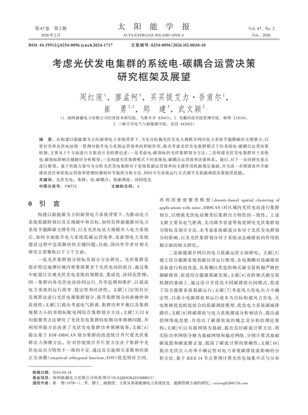 『研报』考虑光伏发电集群的系统电-碳耦合运营决策研究框架及展望